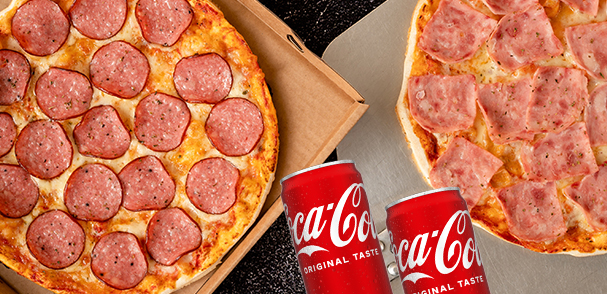 Lielā Salami (40 cm), Kebab (30 cm) un jebkura cita pica (30 cm) + Coca-Cola 1.5L